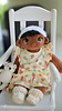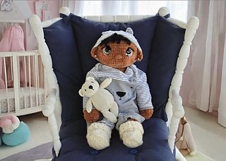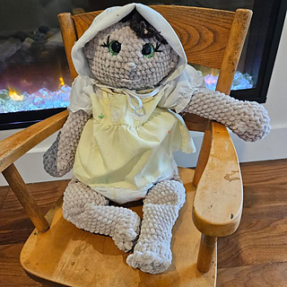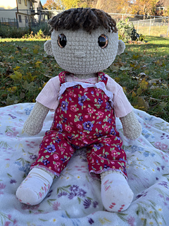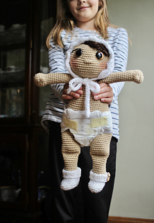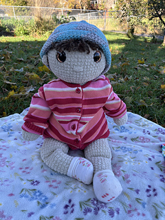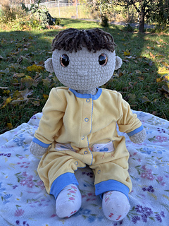 It is designed to fit in newborn and 0-3 month clothing as well as size 1 diapers. Belly button, thumbs, and toes are all a part of the construction. It is no sew except for the ears.