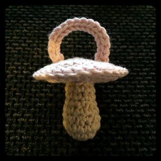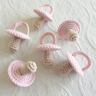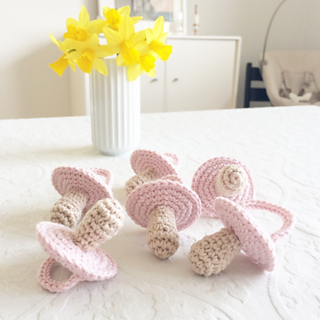 These little pacifiers make the sweetest decoration for a christening table – or perhaps simply displayed on a shelf in a nursery. They are also wonderfully cozy to sit and crochet, and they work up very quickly. So go ahead and get started!