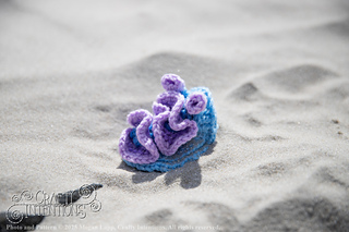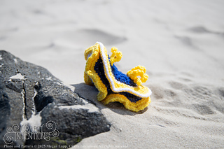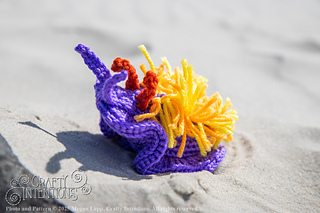 A Teensy Nudibranch from this pattern is 2.5 inches from side to side, 3 inches from top to bottom, and 3 inches long. A Small Nudibranch from this pattern is 3.5 inches from side to side, 4 inches from top to bottom, and 5 inches long.