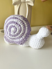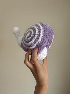 A soft, huggable 23 cm by 22 cm (approx. 9” by 9”) plush amigurumi mini snail!
