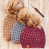 The Mini Waffle Hat features a squishable waffle texture done in a smaller gauge than the usual waffle stitch. The hats are crocheted top-down with worsted weight yarn and a size J crochet hook. The pattern is written in four sizes: adult large/xl, adult small/medium, child (5-12), and toddler (2-4). The hat lengths measure 9 ¼” for adult large/xl, 8 ½” for adult medium/small, 7 ¼” for child, 6 ¾” for toddler. Finish the hats with purchased or DIY pompoms.