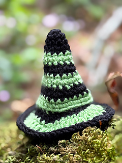 Whip up a spooky-cute mini crochet witch hat using DK yarn and a 4 mm/US G-6 hook.