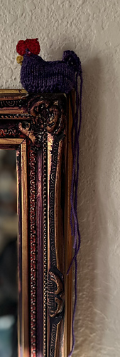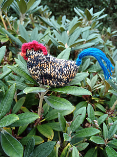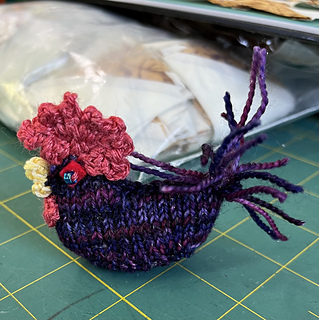 DK or a combination of yarns to bring the weight up to DK equivalent. I have also used fingering yarn samples from Miss Babs that are listed as 10 yards. And used even smaller needles. You will also need less than 1 meter of Fingering weight yarn or DMC # 25 embroidery thread for beak, wattle and cock’s comb. I used DK weight yarn in a contrasting color for the tail. Colors are up to the knitter. Smaller needles and thinner yarn will make a smaller MiniChick. See the Long Tailed MiniChick project.