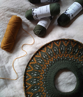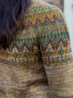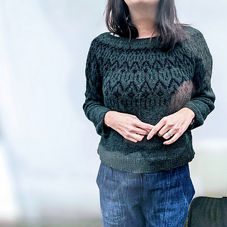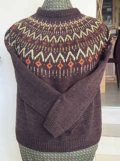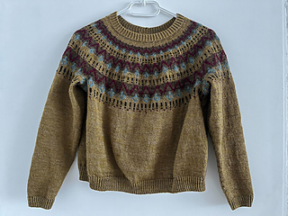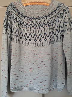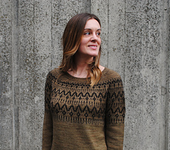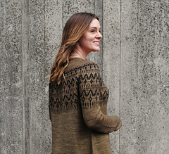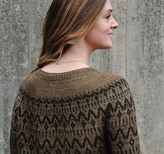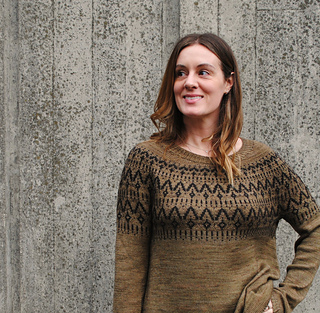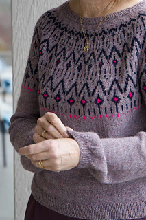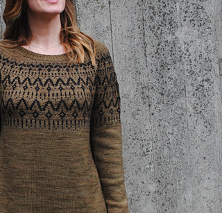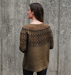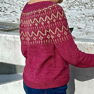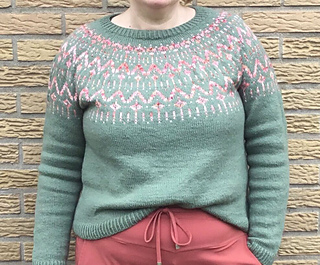 This garment is worked top-down, in the round. After the neckband, short row shaping is incorporated to optimise fit. The majority of the yoke features a stranded colourwork pattern. Once the yoke is completed, stitches are separated into body and sleeves, which are each worked separately and in the round. The stranded colourwork pattern is completed in the upper body and sleeves, after which each are worked in stockinette and finished with half-twisted ribbing.