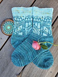 A detailed step-by-step guide for stranded colourwork socks from size US 4 to 13, which are knitted toe up. The socks have a horseshoe heel and gussets. You can choose from 5 widths with 60, 64, 68, 72 or 76 stitches, so you get a great fit. The instructions are adapted to the highquality sock yarn of Hand dyers and should not be knitted with thinner yarns.