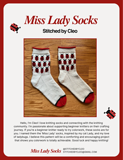 Hello, I’m Cleo! I love knitting socks and connecting with the knitting community. I’m passionate about supporting beginner knitters on their crafting journey. If you’re a beginner knitter ready to try colorwork, these socks are for you. I named them the ‘Miss Lady’ socks, inspired by my cat Lady, and my love of ladybugs. I believe this pattern will be a comforting and encouraging project that shows you colorwork is totally achievable.