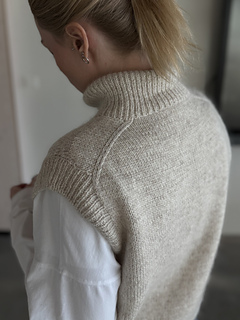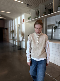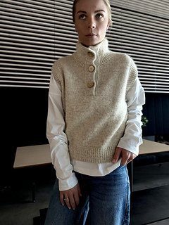 The Mistfall Vest - modern knitted slipover with a high neck and button placket, worked bottom-up in worsted weight yarn for a cozy, timeless fit.