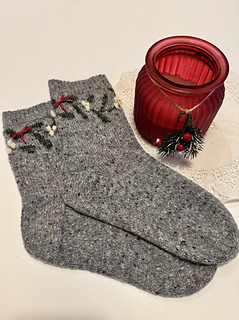 - 4-ply fingering sock yarn in your choice of colors (I’ve used grey as main color, green for the mistletoe leaves, white for the bobbles(approximately 8 meters), and the tiniest bit of red for the bow)