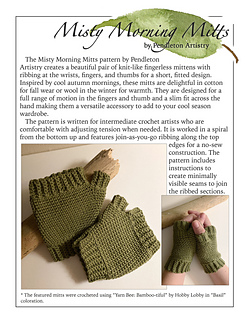 The Misty Morning Mitts pattern by Pendleton Artistry creates a beautiful pair of knit-like fingerless mittens with ribbing at the wrists, fingers, and thumbs for a short, fitted design. Inspired by cool autumn mornings, these mitts are delightful in cotton for fall wear or wool in the winter for warmth. They are designed for a full range of motion in the fingers and thumb and a slim fit across the hand making them a versatile accessory to add to your cool season wardrobe.