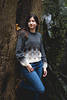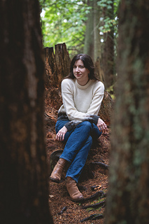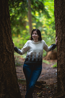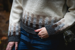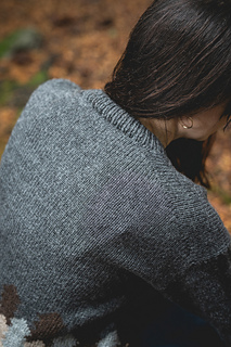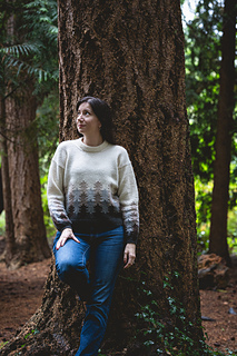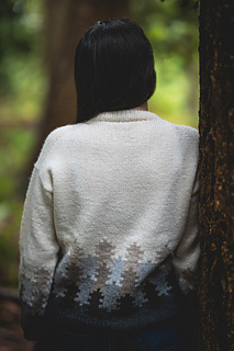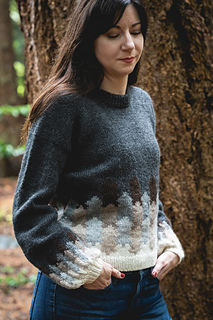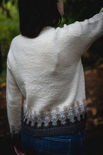 Misty Pines is a top down drop-shoulder sweater with an option of 3 different colorwork motifs on the bottom of the body and sleeves. The back yoke is worked flat, working short rows to shape shoulders to desired length. Next, there is some underarm shaping before the back panel is put on hold. The left and right shoulders are picked up while working additional shaping until casting on collar sts to join all sts and work in the round.