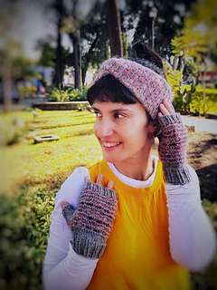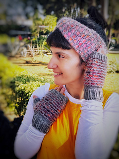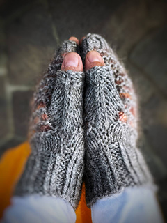 DK weight yarn (193 m / 100 g) in two different colors, or fingering weight yarn held together with a lace weight yarn. The amount of yarn you will need will depend on your size chosen and the length of the mitts.