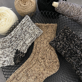 この靴下は、ソックヤーンの中細(Fingering)を2本引き揃えて並太(DK)で編みます。もしくは並太(DK)の1本どりで編みます。
