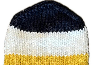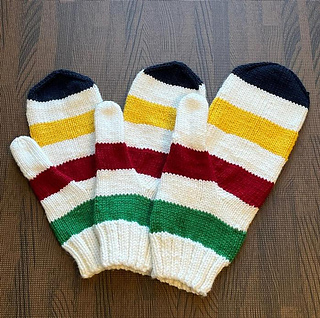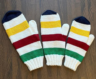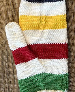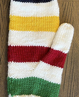 These Hudson Bay inspired mittens are knit in the round from cuff to fingertip.