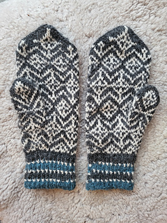 Stitch count: Cuff: 48 stitches. Mittens above the thumb opening: 60 stitches.