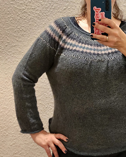 Móberg is a pullover knit from the top down. Starting after the collar with a provisional cast on The yoke is knit with the colour work chart, with increases before and after the colourwork. The body finishes with a 3 colour I-cord with a curved edge. I think it is a beautiful way to frame in the sweater with the multi colour I-cord. I prefered to have the sleeves ¾ of the length but you may prefer longer as long if you decide. If you choose longer sleeves, ensure you have allowed this is your wool purchase.