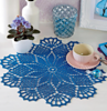 Round blue doily with delta-crochet diamonds and scalloped edge.