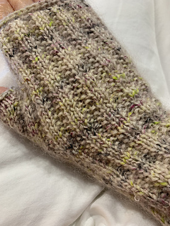 You will work in the round, from the wrist. The mitts are formed by working simple knits and purls. You will be increasing for the thumb and placing stitches on hold.