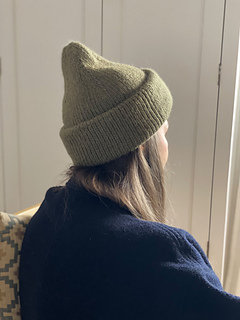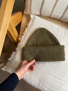 The hat is worked top-down (starting at the crown) in all-over 1×1 rib using the Magic Loop method. The upper half is shaped with increases, then the body continues in 1×1 rib without further increases. Two brim folds are worked after a specified length.