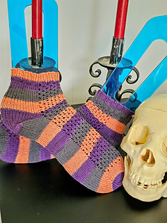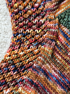 I have knit this in a variegated Southern Skeins Sock yarn and solid stripes Knit Picks Felici, both working up beautifully. You may knit this in any yarn you wish. I do recommend using something with nylon for socks and a tonal if you want the pattern to pop more than the color.