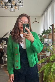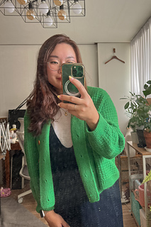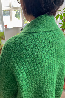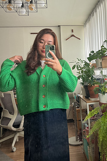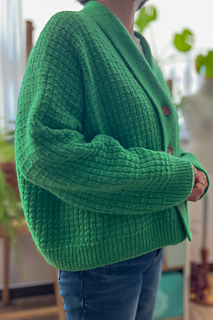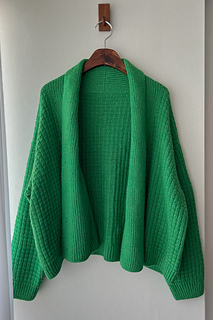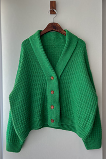 모눈이뇽 가디건은 탑다운 드랍숄더 구조로 자연스러운 어깨선과 여유로운 실루엣이다. 넓게 목을 감싸주는 숄 칼라는 단추 여밈으로 열고 닫을 수 있어 실용성과 스타일을 동시에 갖추었다. “모눈”이라는 이름처럼 겉뜨기와 안뜨기만으로 완성되는 네모무늬는 쉽게 뜰 수 있으면서도 전체적으로 깔끔한 포인트가 된다. 넉넉한 오버사이즈 핏 덕분에 누구나 편하게 입을 수 있으며, 아우터처럼 걸치기에도 적합해서 가을과 겨울에 다양한 옷과 매치하기 좋은 데일리 가디건이다.