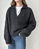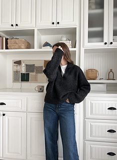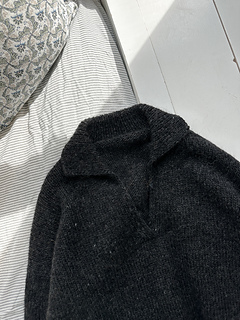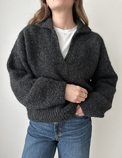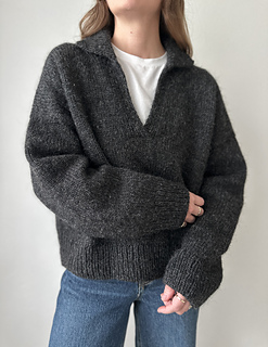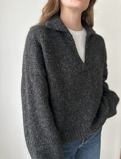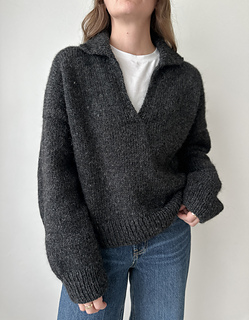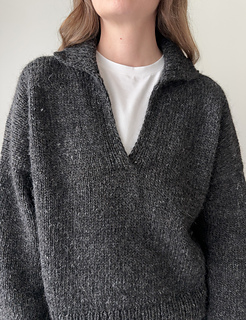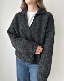 The Moon Set Polo is a timeless wool sweater with classic details. Worked from the top down and shaped with German Short Rows, it ensures an excellent fit. This design features a loose silhouette, a deep v-neck, and serves as an ideal layering option.