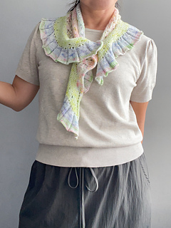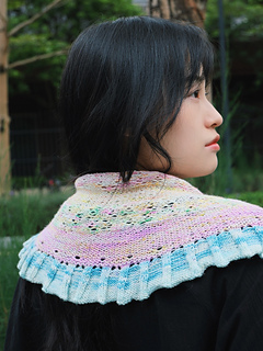The larger shawl can be worn with the straight edge along the shoulders or reversed so the frilled edge frames the neckline. Both options drape beautifully. The mini version features a button closure that can be fastened through any yarn-over hole, offering multiple styling possibilities. Enjoy experimenting with different ways to wear and showcase your Moonlake!