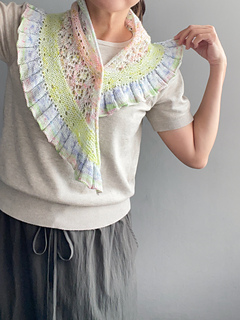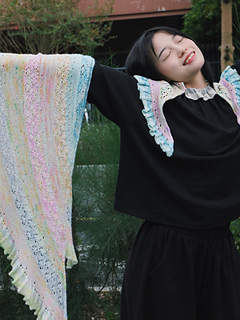 A crescent-shaped shawl adorned with floral lace and soft frills,