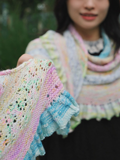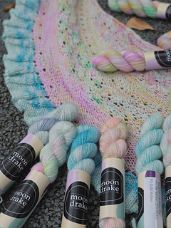 Moonlake is a crescent-shaped shawl inspired by ancient Chinese mythology where the lunar goddess gave birth to twelve moons and bathed them in celestial waters. The design combines floral lace with garter stitch sections, and finishes with a rippling edge, creating rhythm and textures throughout the piece. Worked from the top down, the shawl begins with a stockinette tab cast-on and uses short rows and increases to form its curved shape.