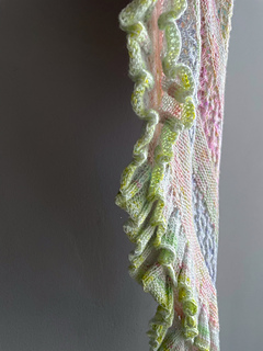 Larger shawl worked with 12 colourways (one for each “moon”).