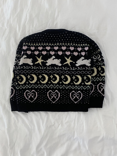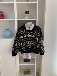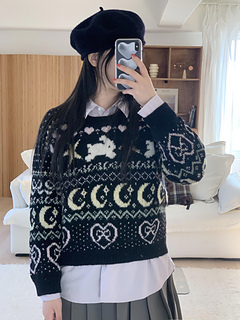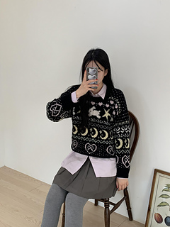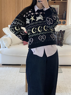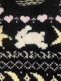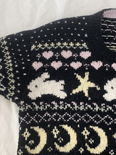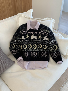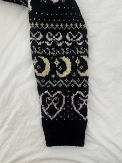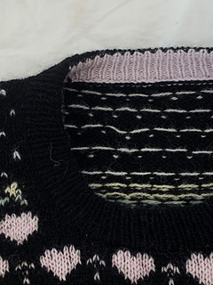 The Fair Isle and intarsia sections on the front and back panels are worked flat, while the body and sleeves are worked in the round using circular Fair Isle.