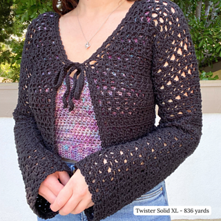 SHORT Sleeve Sample used 7.1oz - 560 yards of Acacia yarn from Hobbii - 51% Acrylic, 49% Cotton. LONG Sleeve Sample used 13.4 oz - 835 yards of Twister Solid XL - 55% Cotton, 45% Acrylic.