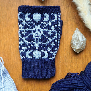 Moonlit Moths Fingerless Mittens are a striking pair of mittens inspired by moonlit nights, quiet rituals, and the beauty of nocturnal symbolism. Knit in the round using the magic loop method, this design features a bold death’s-head moth motif paired with flowing moon cycle imagery that wraps around the hand.