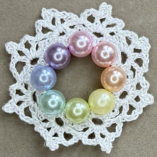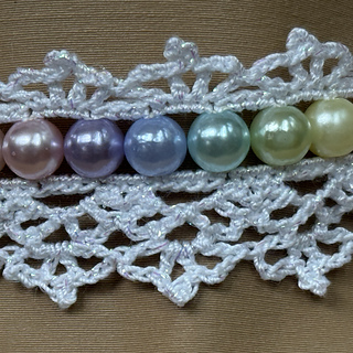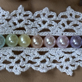 Elegant lacy jewelry full of curves and picots, worked along a string of beads. The pattern notes include instructions on how to string the beads in order to crochet the lace along the sides.