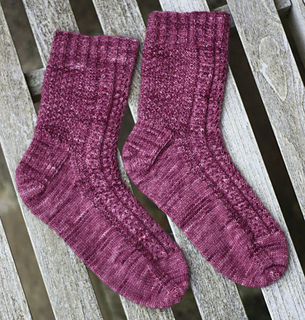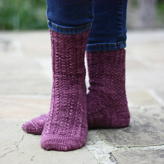 Thoughts of the young Jane Eyre walking on the moors inspired this classic, timeless sock design. Small horn cables reflect the tussocks of heather which border the moorland paths. Double moss-stitch echoes the block-like patterns of cobbled streets in the Brontë village of Haworth.