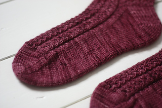 Worked top-down in the round, the Moor House socks have a slip-stitch heel flap, a gusset, and a grafted toe. They feature a variety of textures, with mock cable ribbing for the cuff, double moss-stitch on the back of the leg and a lace and cable pattern which continues down the front of the leg and along the top of the foot.