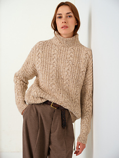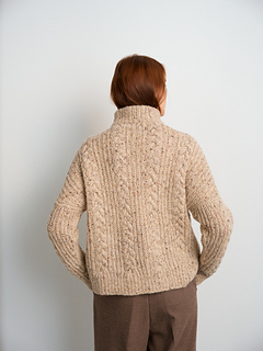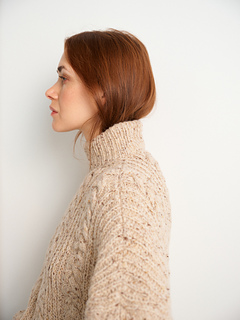 This sweater features a simplified modified drop-shoulder construction with short-row shoulder shaping and armhole increases. The back and front are worked flat from an optional Tubular Cast-On, then joined at the shoulders with a Three-Needle Bind Off and blocked. Sleeves are picked up at the armhole and worked flat from the top down, finished with an optional Italian Tubular Bind-Off. The mock turtleneck is picked up and worked in the round, then folded inward and whipstitched down. Then underarms and sides are seamed.