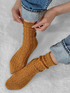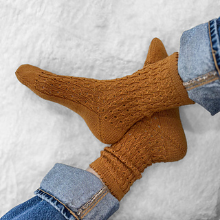 These socks begin with a folded picot edge cuff, then a delicate yet simple lace is worked down and un-interrupted to the boomerang heel then finishes off with a classic wedge toe. Light, pretty, and perfectly peaceful; these will bring a little moment of calm for your needles.