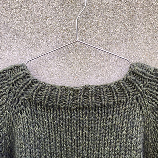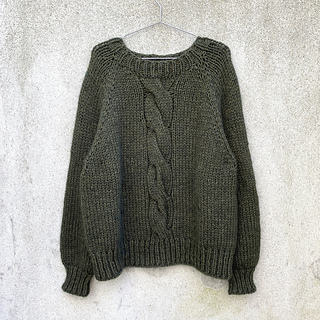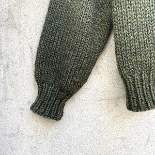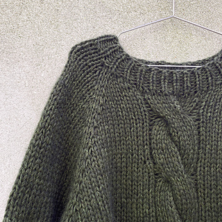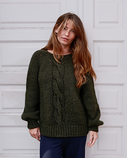 Yarn: 2 strands of Knitting for Olive Heavy Merino (125 m 137 yd / 50 g 1.8 oz), worsted-weight yarn, 8 (8, 9, 10, 11, 12, 13, 13, 14) balls + 2 strands of Knitting for Olive Soft Silk Mohair (225 m 246 yd / 25 g 0.9 oz), lace-weight yarn, 5 (5, 5, 6, 6, 7, 7, 8, 8) balls. Sample is in Heavy Merino + Soft Silk Mohair in Slate Green colorway