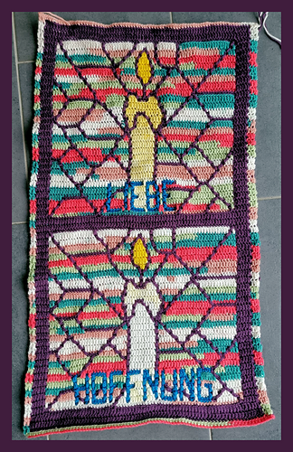 Since the mosaic glass is supposed to be colourful, I have also added colouring pages to print out, so you can think about and try out which colour variation you would like to make before the start of our Advent Cal 2025. Of course, there is an easier way where you don’t have to constantly change colours; there are wonderful colour gradient yarns or batik yarns that you can use.