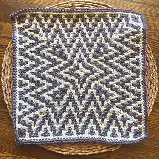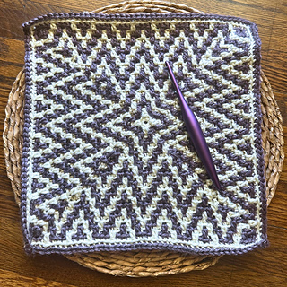 This mosaic crochet blanket square features eye-catching zigzags that burst from the center and radiate outward. You’ll use overlay mosaic crochet, an easy colorwork technique, to create a clean, graphic design.