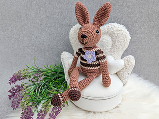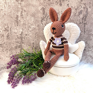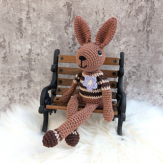 This cute little bunny here is really easy to make. The arms and legs will be crocheted in. You’ll only have to sew on the ears and the head. Mr. Bunny has dangling legs and thus can only sit and not stand unsupported.