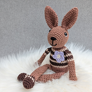 Dieser süße kleine Schatz hier ist recht schnell und einfach gehäkelt. Die Arme und Beine werden direkt mit eingehäkelt. Annähen müsst ihr am Schluss nur noch die Ohren und den Kopf. Der Hase hat Schlenkerbeine und kann somit nur sitzen und nicht stehen.
