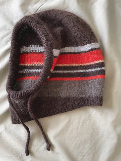 Start by creating the top section, then pick up stitches along the edge to knit the hood downward, incorporating striped color work at this part.