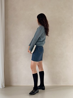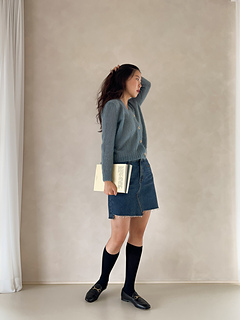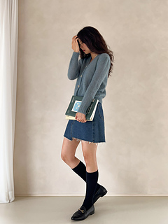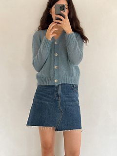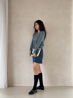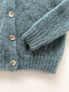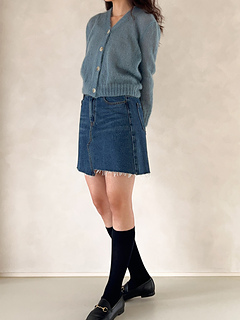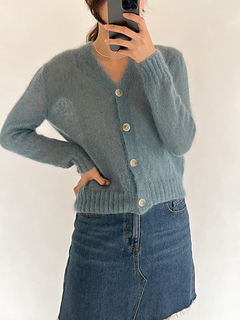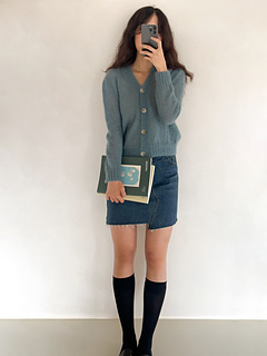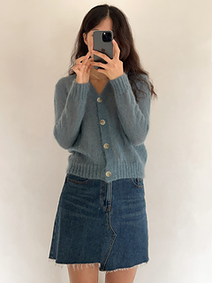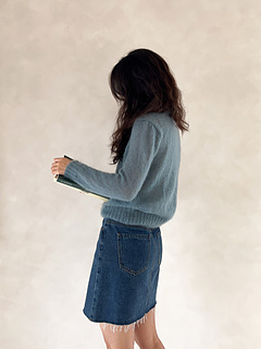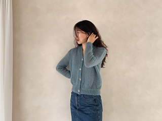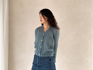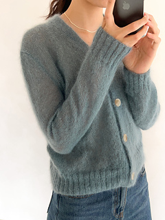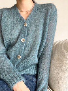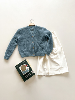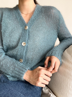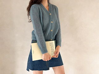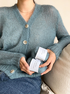 This cardigan is worked in pieces — back, front, and sleeves — and then seamed together. It features the distinct shoulder line and neatly shaped sleeve cap that only a bottom-up construction can offer. The double-knitted button band gives a clean and structured finish. Worked with a single strand of Mulberry Silk Mohair, it creates a soft and voluminous texture, resulting in a refined and elegant garment even with just one strand. The pattern combines written and charted instructions, making it accessible for knitters who are familiar with reading patterns.