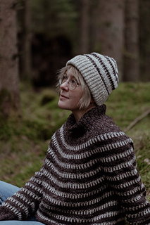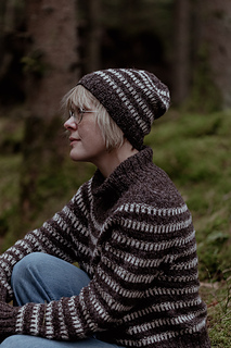 The Mulm hat is knitted from the crown and down. It has the same textured stripes as the Mulm sweater from the book The Island and the Forest. The hat is knitted in an organic, rustic British wool, where the shades are achieved by combining different colours of natural wool. Choose which of the pattern’s two versions you’d like to make – a standard rib brim, or a folded one!