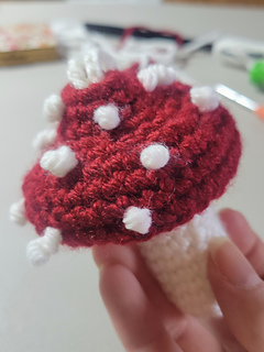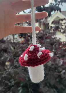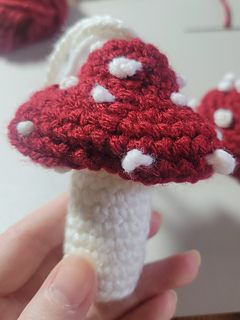 This pattern pdf is 14 pages with detailed photos, abbreviation key, and a print-friendly text-only pattern page. Also included are instructions on attaching the charm to a bag using a lark’s head knot and two options for making the mushroom spots.
