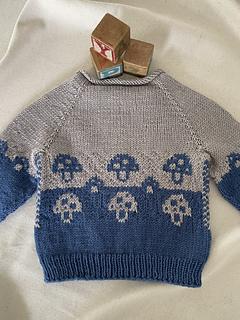 The Mushroom Sweater is a cute little jumper or pullover that is knitted in one piece from the top down, featuring mushrooms in stranded colourwork.