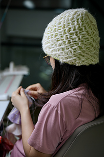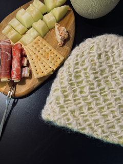 The Muskmelon Beanie features a double-layered structure. We begin by casting on and working the outer honeycomb layer in the round. Once this reaches the desired length, we switch to a smaller needle and a new yarn to knit the inner layer. The inner layer is worked without any increases or decreases until it reaches the crown, where shaping is created through gradual decreases. After closing the top of the inner layer, the crown of the outer honeycomb layer is gathered and secured.