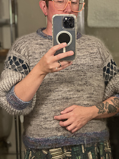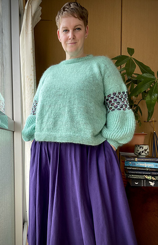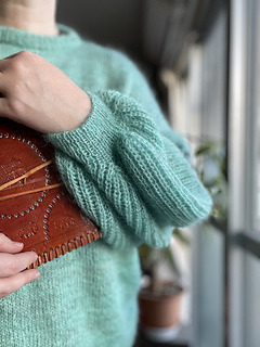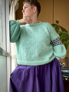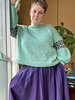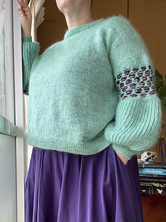 The jumper is worked in one piece from the bottom up to the underarm. If you want to add bust darts, you add them before splitting the front and back. Both are worked separately shaping the modified drop shoulder including decreases at the arm scye. After seaming the shoulder, stitches for a fold over neckband will be picked up and the edge will be bound off together with the stitches from the pick up row on the inside of the neckband. Stitches for the sleeves are picked up and the sleeve worked from the top down. The difference in circumference is created by using the different gauges for Brioche Rib and Wasp stitch. There is only shaping at the wrist to work the cuff.