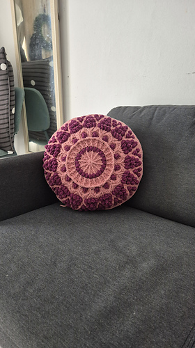 each round with ss. Panels are then partially assembled before cushion insert is added. Cushion is then closed completely with sts